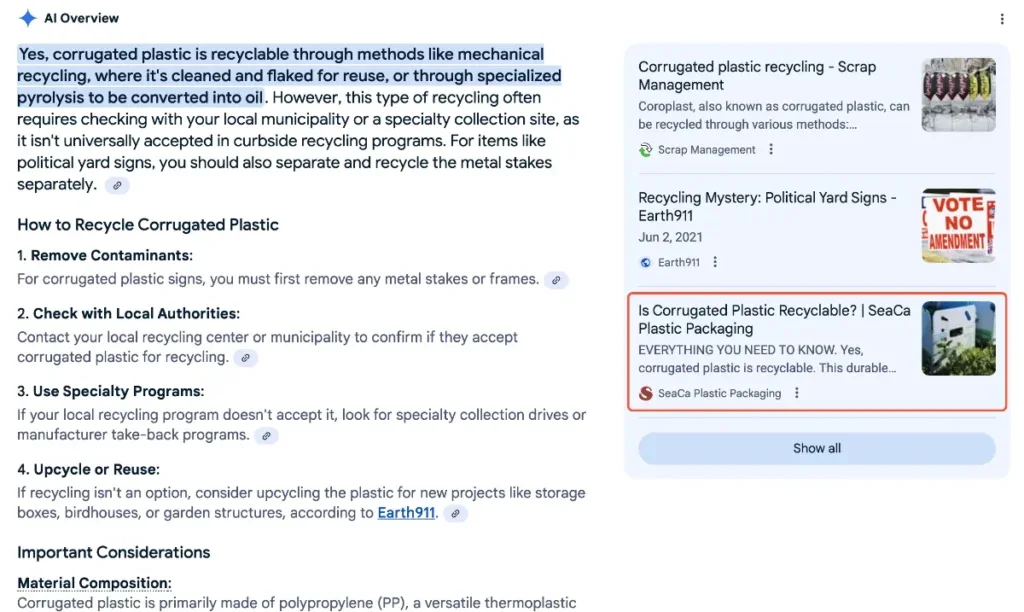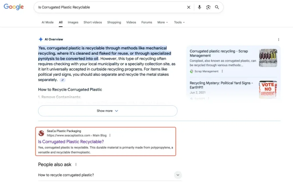For instance, the post “Is Corrugated Plastic Recyclable?” quickly reached the top organic position, earned a featured snippet, and is now cited in AI overviews — proving its mid-funnel value for both traffic and education. Similarly, “Types of Packaging” ranks on page one for broad, early-stage queries, attracting researchers and funneling them toward product pages. These examples show how a theme-driven blog strategy supports visibility, engagement, and conversion across the funnel.